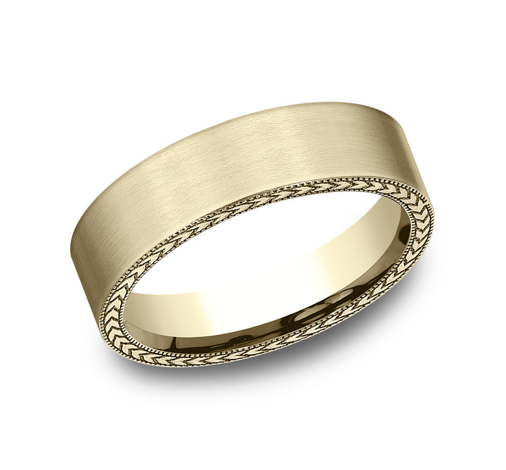 6.5mm, Comfort fit 14K Yellow Gold Satin finish, wheat patterned edges