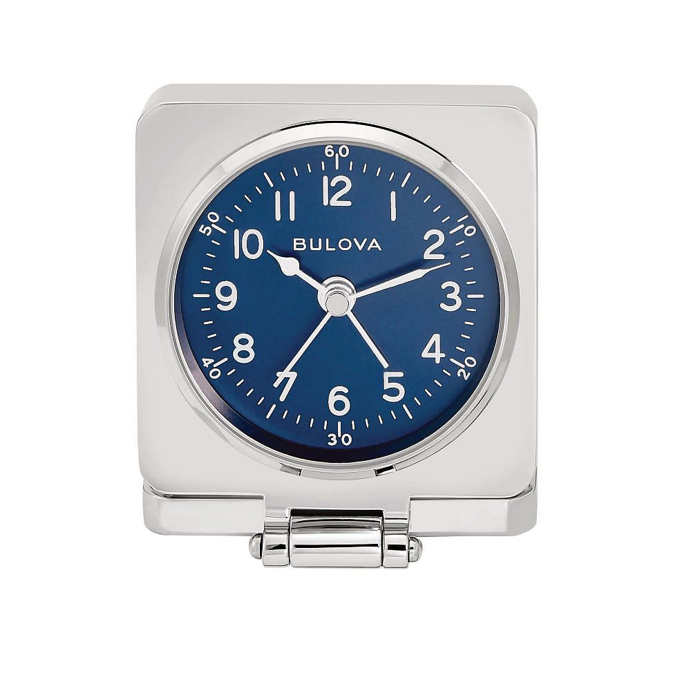 Elegant cast metal flip travel alarm can also be used as a compact space saving desk clock. Mirror plated polished finish