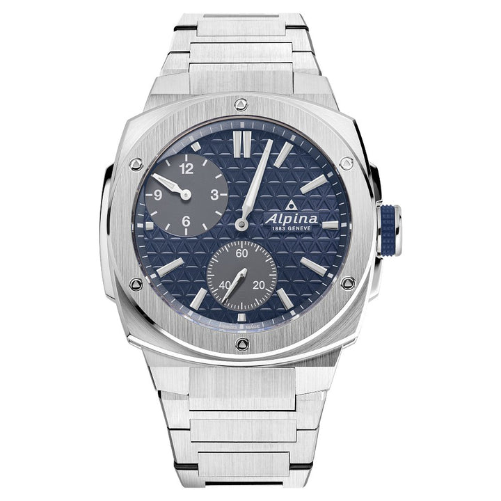 The Alpiner Extreme Regulator Automatic is the perfect rugged sport watch. Separate display of the hours, minutes and seconds, set inside a heavy-duty 41 x 42.5mm case with see-through back, and able to withstand extreme conditions. Navy blue dial with triangle pattern, grey outer ring with white markers. Grey hour counter at 10 o'clock, hand-polished silver color hour, minute hands. Grey second counter at 6 o'clock with silver color second hand. Set on a brushed and polished stainless steel bracelet with folding buckle, this timepiece is water resistant up to 200M.