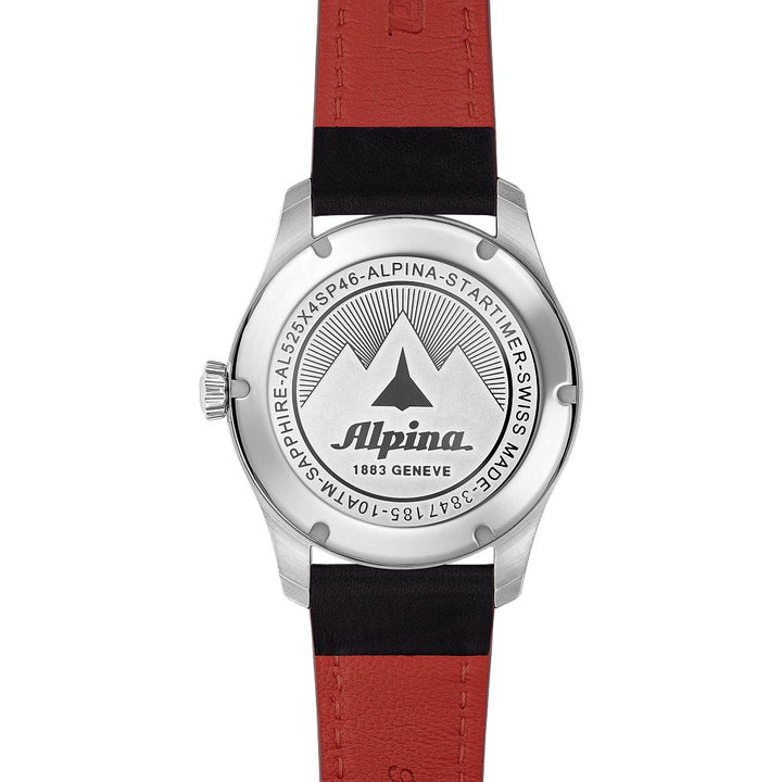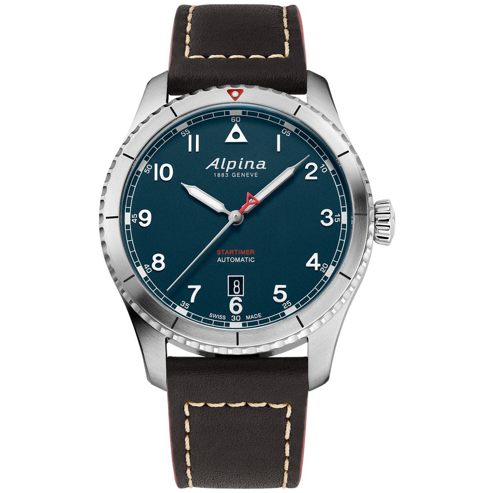 The Alpina Startimer Automatic, inspired by its heritage look and incomparable precision, features a 41mm brushed and polished 2-part stainless steel case and notched bezel, designed in the early days of aviation, making it easier to grip with gloves. WR to 100M, with a blue dial featuring a date window at 6 o'clock. Outer ring with seconds graduation. Set on a brown calfskin leather strap, with off-white topstitching and red trim. Perfect for the aviator at heart.