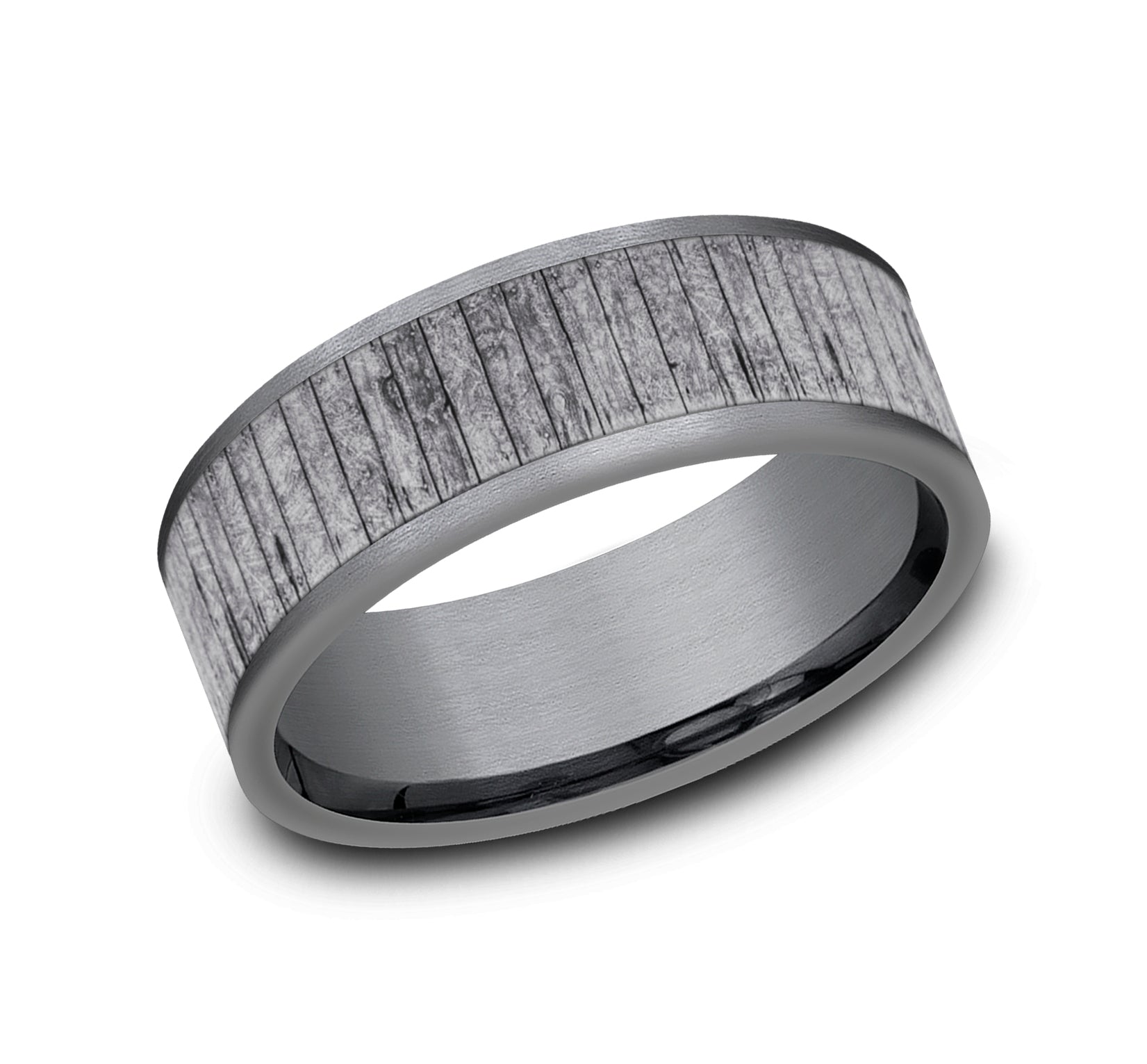 8mm, Comfort fit Grey Tantalum Split wood patterned center, straight edges