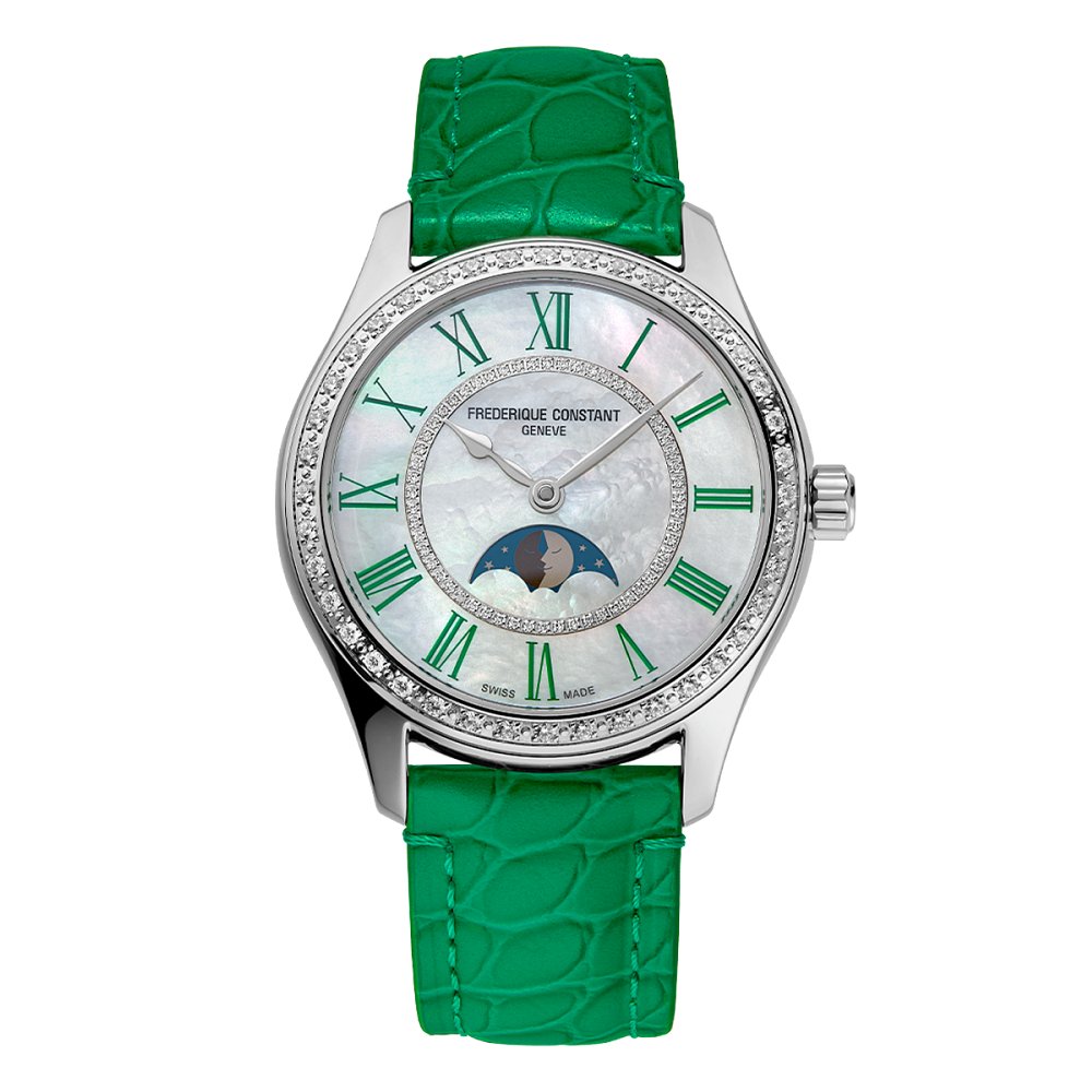 The Classics Elegance Luna features a moon evocative of romance and intimacy: two half-moons embrace amid a mother-of-pearl dial housed in a 36mm steel case. Powered by the automatic FC-331 caliber with a 38-hour power reserve, it features a jewel-set minute track and bezel, for a total of 96 diamonds (1.17 carats), and Roman numeral hour markers matching the timepieces leather strap.