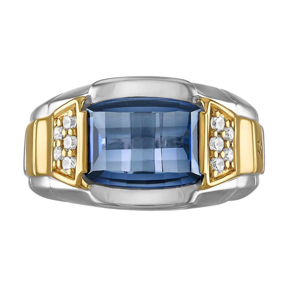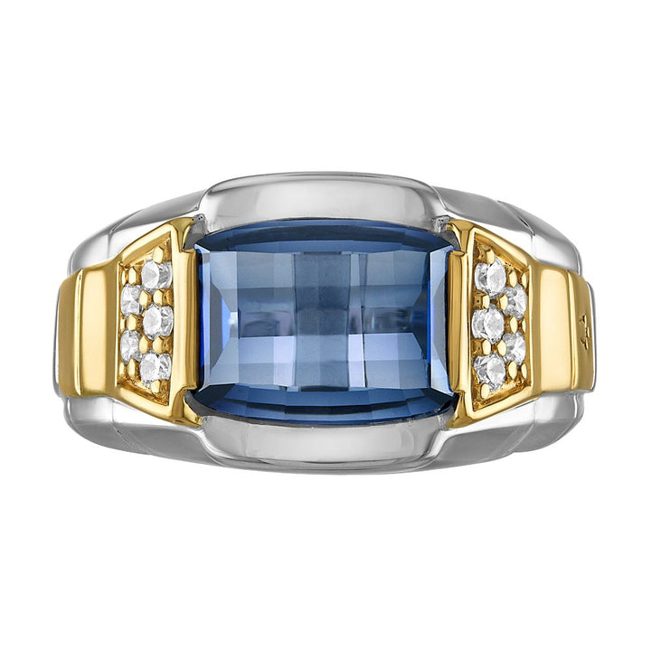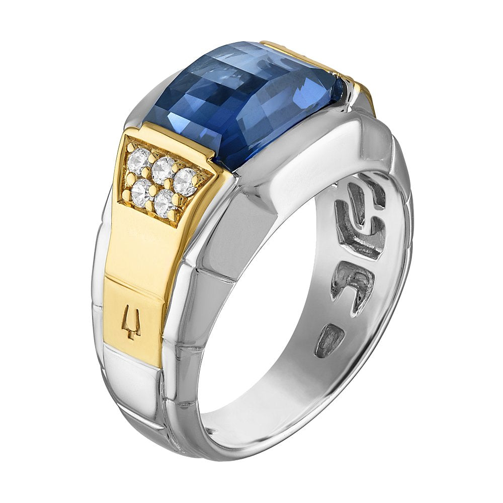 Two-tone barrel cut ring features a lab-created sapphire, a symbol of durability said to bring luck, loyalty and happiness. Made of sterling silver in a ridged design. Sides feature white diamonds totaling 0.10 CTTW and accented with 14K gold-plating subtly etched with Bulova signature tuning fork logo. Size 10.