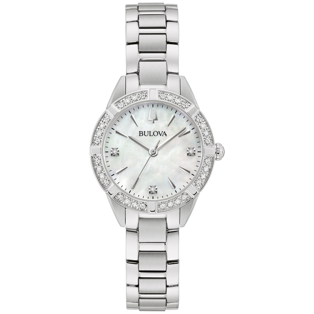 This beautiful addition to the Bulova Ladies' Sutton collection offers a sophisticated timepiece for every occasion. The slender silver-tone stainless steel case is set with 16 dazzling diamonds and features a domed sapphire crystal for exceptional clarity. The lustrous genuine mother-of-pearl dial is accented with 3 diamonds and silver-tone hands and hour markers. Completing the timepiece is a matching silver-tone bracelet with a push-button deployant clasp. For the refined woman, the Bulova Ladies' Sutton provides a timepiece that doesn't compromise.