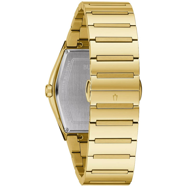 Distinctive asymmetrical tonneau shaped gold-tone stainless steel case with a black signature Futuro edge to edge curved metalized crystal features a black dial with gold-tone accents, and a gold-tone stainless steel bracelet. The watch features a three-hand quartz movement, deployant buckle with pushers, and water resistance to 30 meters.