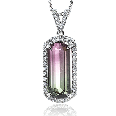 An extraordinary 18.60 ct watermelon tourmaline shines in tones of pink, white, and green surrounded by .40 ctw of white round brilliant diamonds.